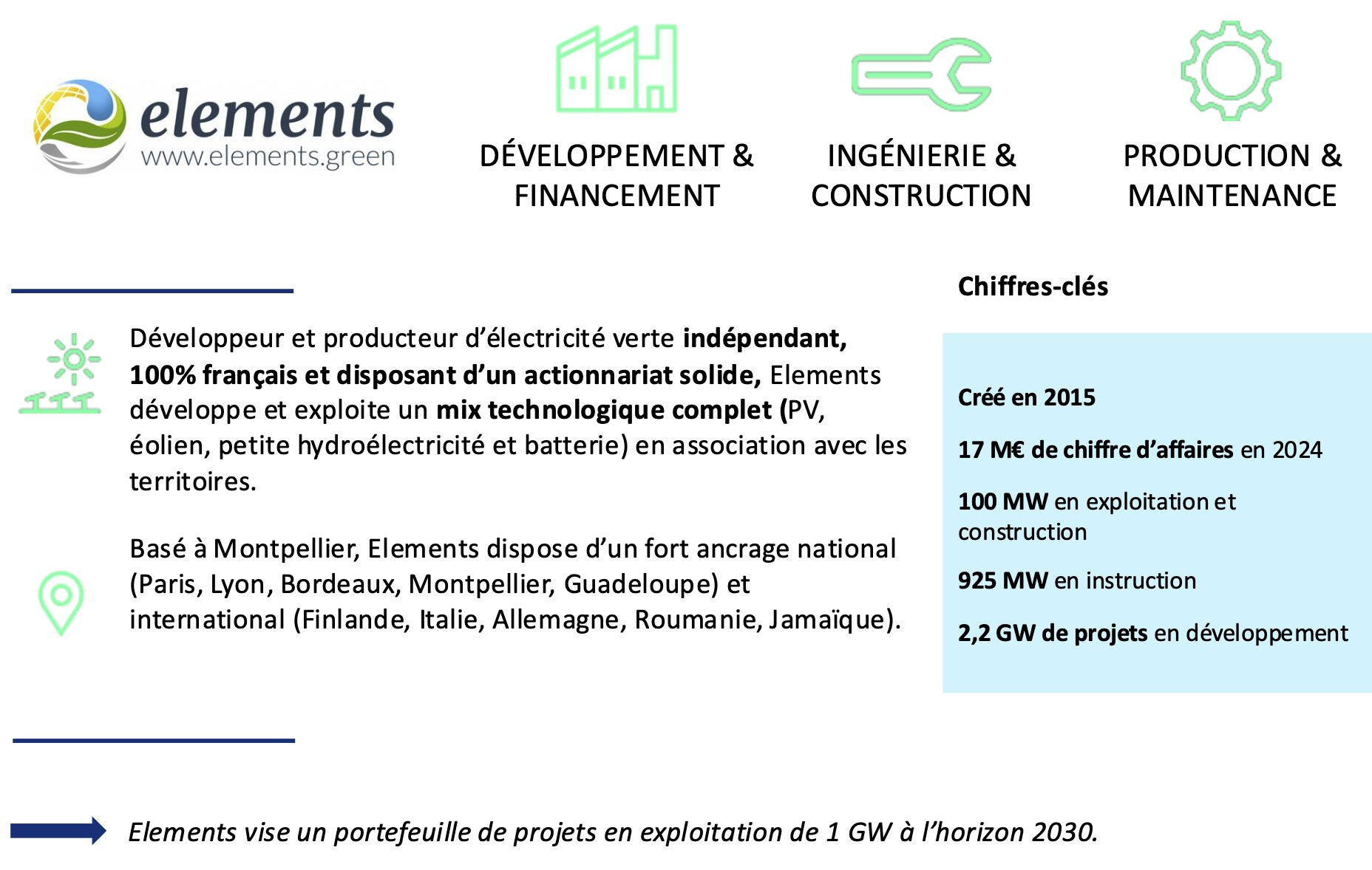 Elements est un producteur d’énergies renouvelables dont la vocation est d’accélérer la transition énergétique par la fourniture d’une électricité décarbonée émanant de projets développés dans le respect des territoires, de leurs habitants et de la biodiversité locale.
