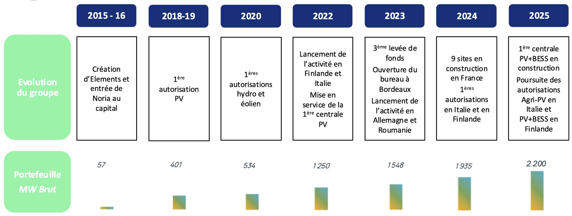 En novembre 2023, l’actionnaire historique d’Elements, Noria, est rejoint par Bpifrance, via son fonds France Investissement Energie Environnement 2 dédié à la transition énergétique et environnementale, 8 caisses du Crédit Agricole, OCCTE via son fonds OCCTE OCCIGEN, et Enerfip Gestion, la société de gestion du Groupe Enerfip.