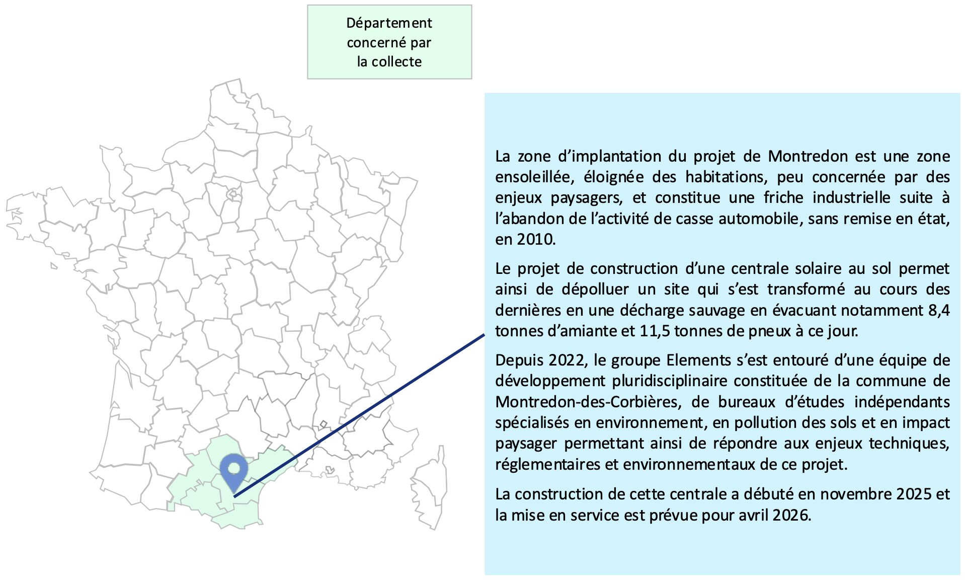 Financement d’un projet de centrale photovoltaïque développée par le groupe Elements et située à Montredon-des-Corbières (11)