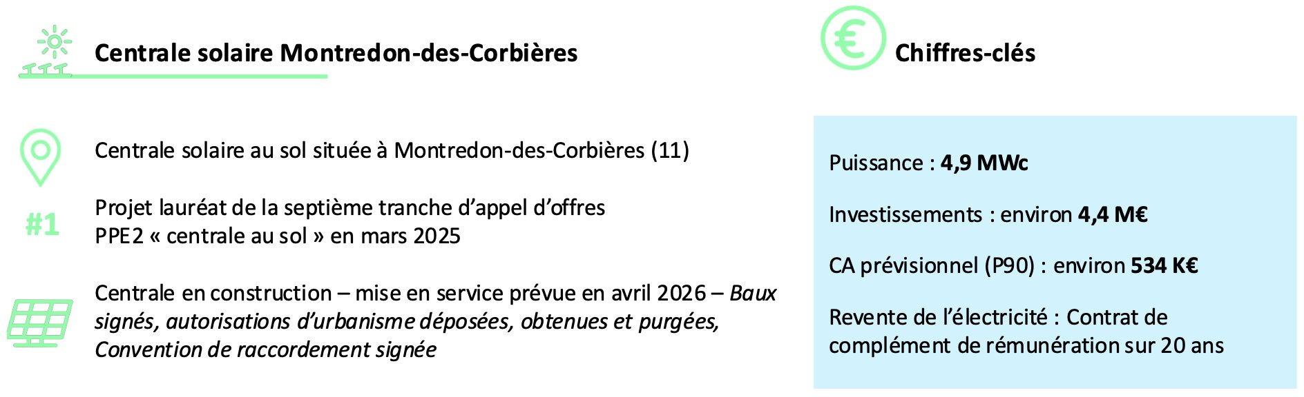 Le groupe Elements a développé une centrale photovoltaïque au sol, lauréate de la septième tranche de l’appel d’offres PPE2 portant sur la réalisation et l'exploitation d'Installations de production d'électricité à partir de l'énergie solaire « Centrales au sol », d’une puissance totale de 4,95 MWc, et située à Montredon-des-Corbières (11).