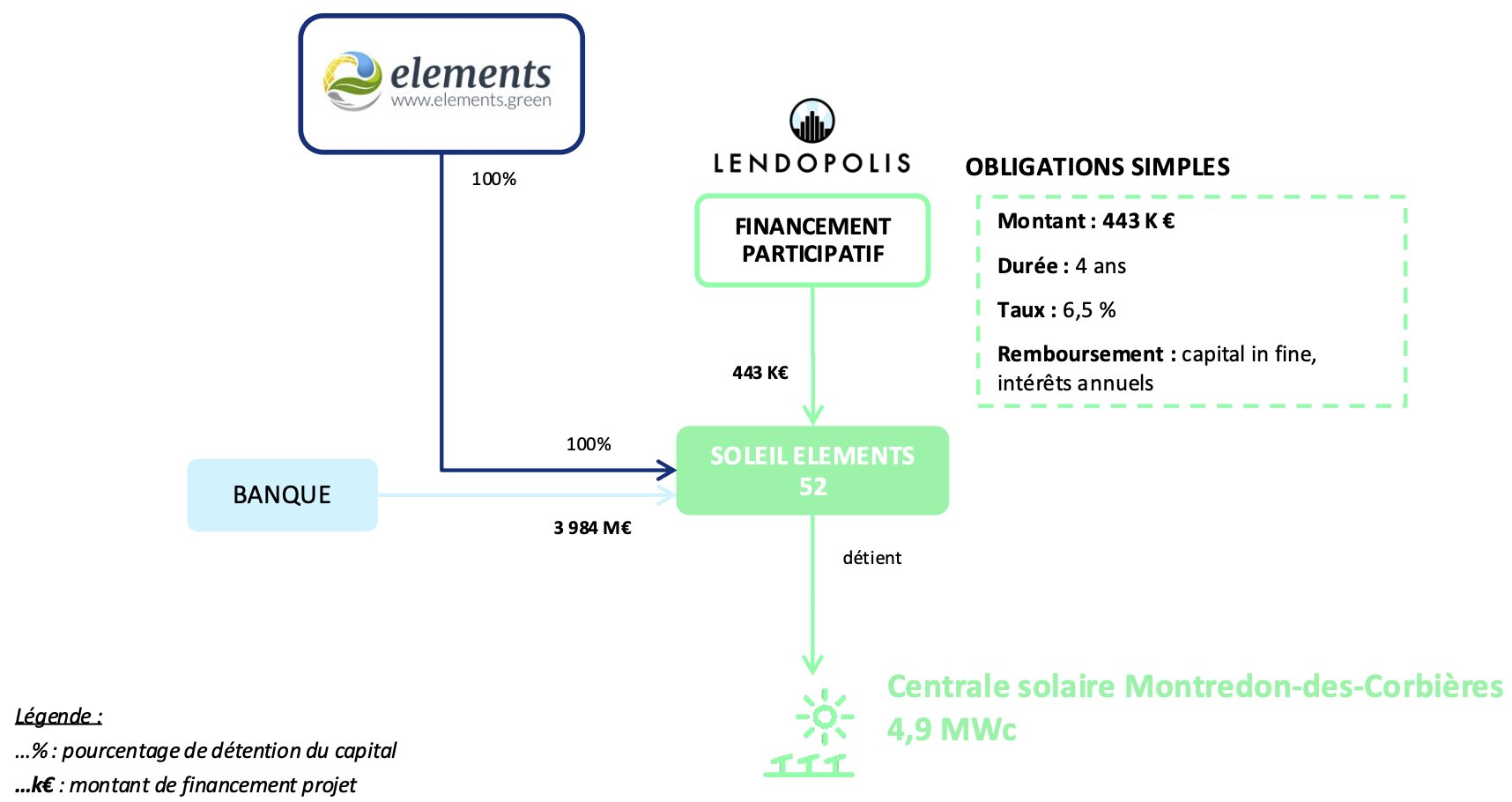 Dans ce cadre, la société Soleil Elements 52, propriétaire de la centrale et filiale à 100% du groupe Elements, réalise une émission d’obligations simples d’un montant cible de 443 K€, afin de financer en partie la construction de cette centrale.