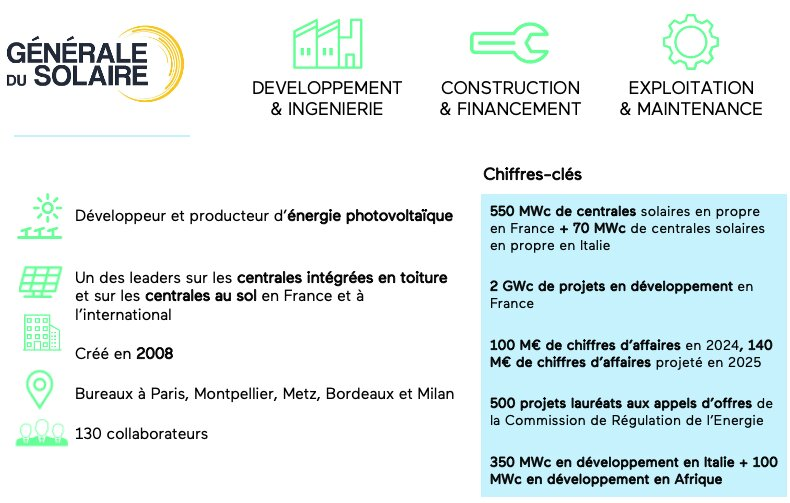 GENERALE DU SOLAIRE compte 130 collaborateurs répartis principalement à Paris (siège social) et à Montpellier, avec également des implantations à Metz, Bordeaux et Milan. En forte croissance, le groupe a réalisé un chiffre d’affaires de 100 M€ en 2024 et prévoit 140 M€ de chiffre d’affaires en 2025 pour l’ensemble de ses activités.