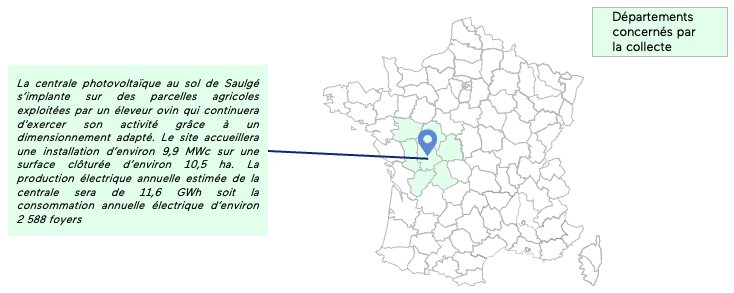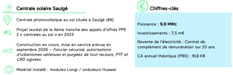Le groupe GENERALE DU SOLAIRE a développé une centrale photovoltaïque au sol, d’une puissance de 9,9 MWc, située sur la commune de Saulgé dans la Vienne (86). Cette centrale, lauréate de la 4ème tranche des appels d'offres PPE 2 « centrales solaires au sol », a à ce titre obtenu un complément de rémunération de l’électricité produite, valable sur 20 ans. Dans le cadre de cet appel d'offres, GENERALE DU SOLAIRE s'est engagé à proposer aux habitants du département d'implantation du projet et des départements limitrophes une partie de son financement.