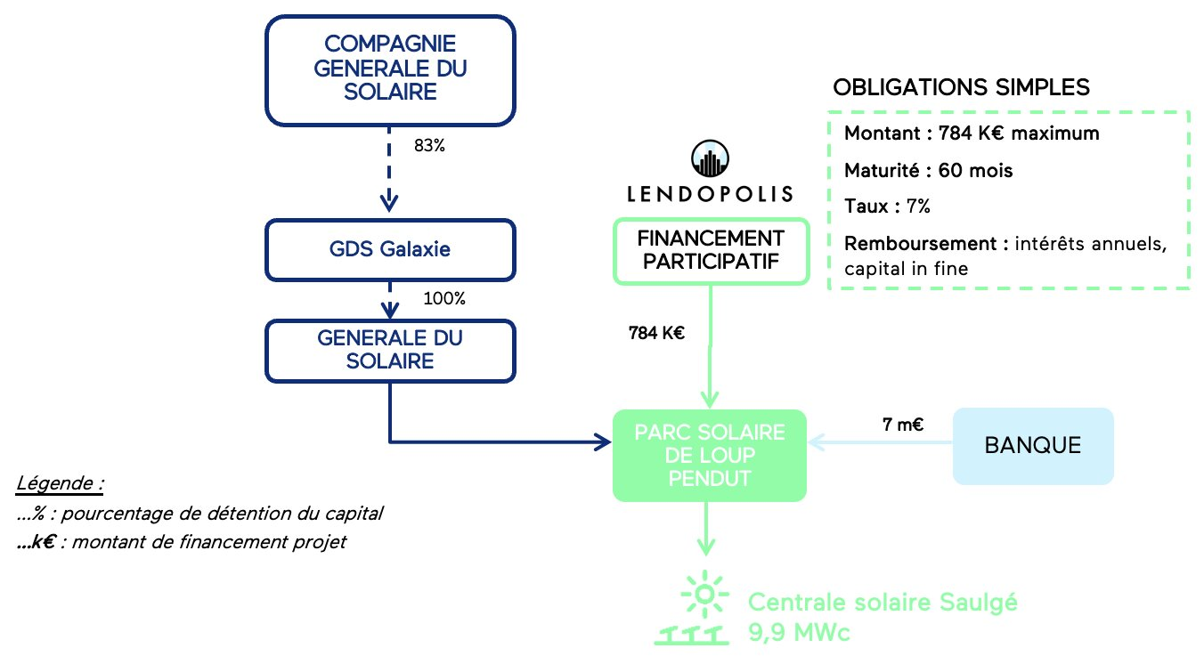 De ce fait, la société PARC SOLAIRE DE LOUP PENDUT, société de projet propriétaire de la centrale, filiale à 100% du groupe GENERALE DU SOLAIRE, réalise une émission d’obligations simples d'un montant maximum de 784 K€, afin de financer en partie la construction et la mise en service de la centrale solaire, réservée aux habitants locaux.
