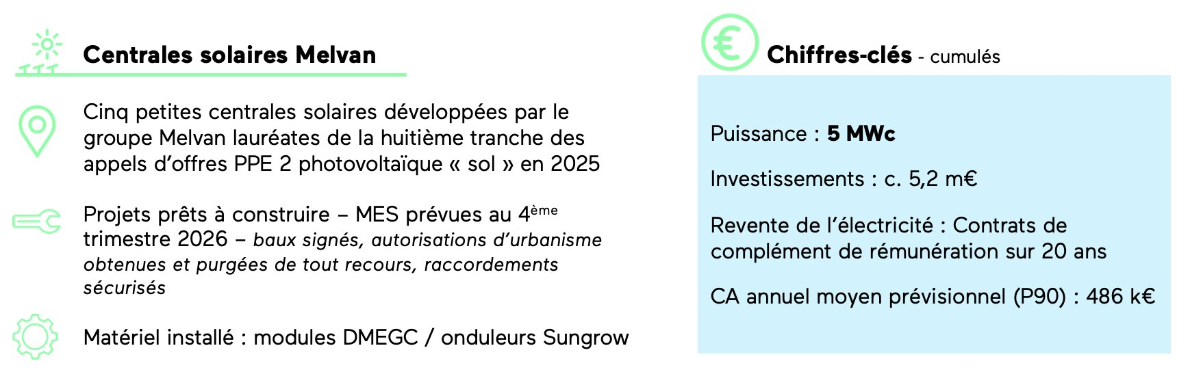 Le groupe Melvan a développé 5 projets de petites centrales photovoltaïques au sol, d’une puissance cumulée de 5 MWc. Les centrales ont été lauréates de la huitième tranche des appels d'offres PPE 2 « centrales solaires au sol », et ont à ce titre obtenu un complément de rémunération de l’électricité produite, valable sur 20 ans.