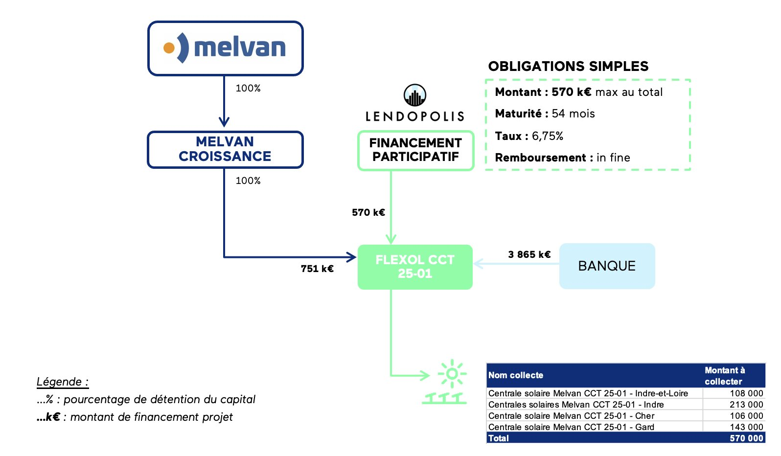 De ce fait, la société Flexol CCT 25-01, société de projet propriétaire des centrales, filiale à 100% du groupe Melvan, réalise plusieurs émissions d’obligations simples d'un montant total maximum de 570 k€ afin de refinancer partiellement les fonds propres permettant la construction et la mise en service des centrales solaires.