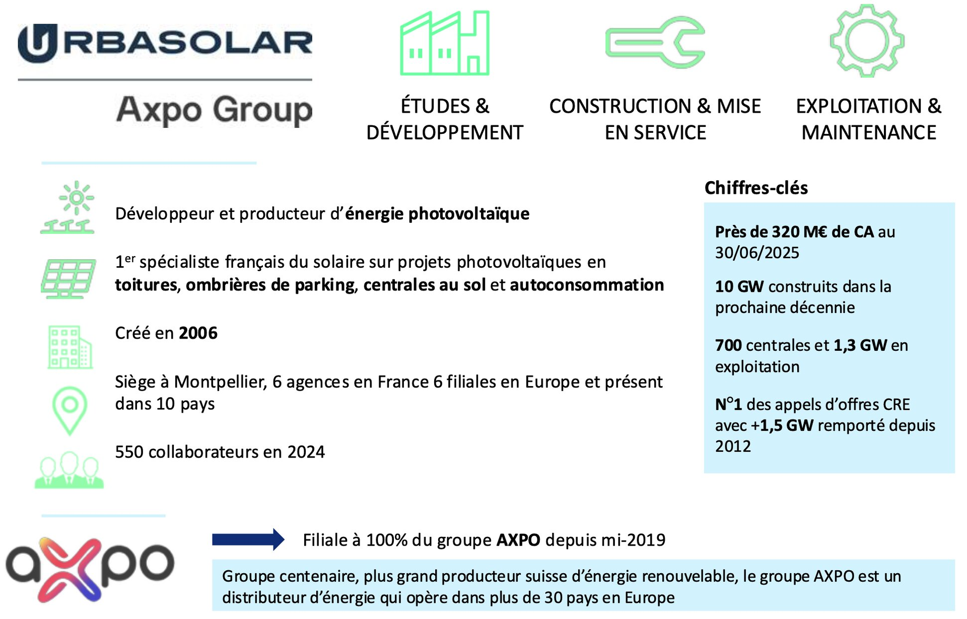 Division solaire du groupe suisse Axpo - distributeur et spécialiste des énergies renouvelables ; leader européen dans le domaine du négoce de l’énergie - Urbasolar agit pour un déploiement massif de l’énergie solaire, avec l’implantation d’actifs répondant aux plus hautes exigences de qualité, œuvrant pour une production d’énergie décarbonée à l’échelle européenne.
