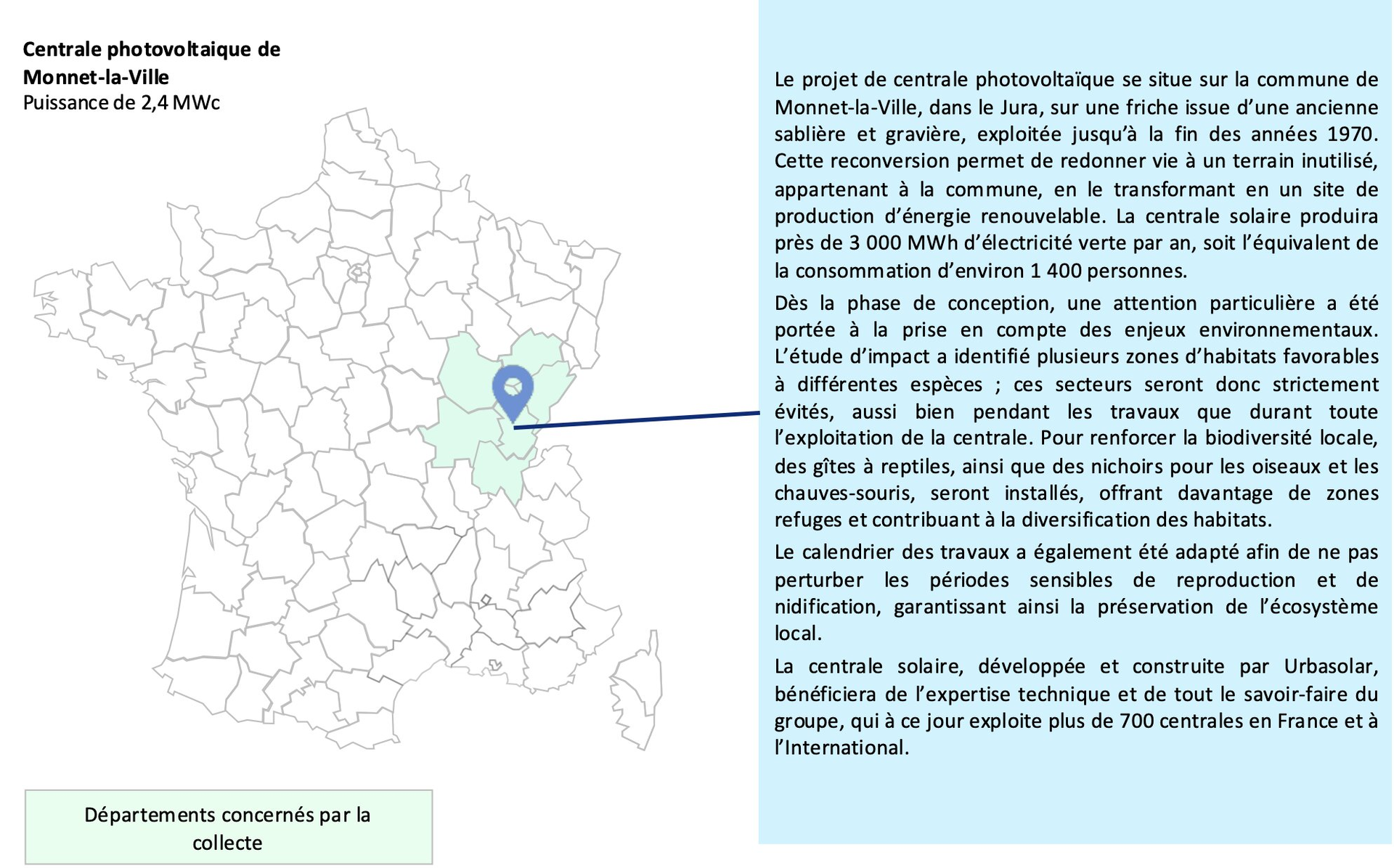 Le groupe Urbasolar a développé une centrale photovoltaïque au sol qui s’implantera sur une friche issue d’une ancienne sablière et gravière, exploitée jusqu’à la fin des années 1970. Cette centrale est lauréate de la sixième tranche de l’appel d’offres PPE2 portant sur la réalisation et l’exploitation d’Installations de production d’électricité à partir de l’énergie solaire « Centrales au sol », d’une puissance totale de 2.4 MWc, et située à Monnet-la-Ville dans le département du Jura (39).