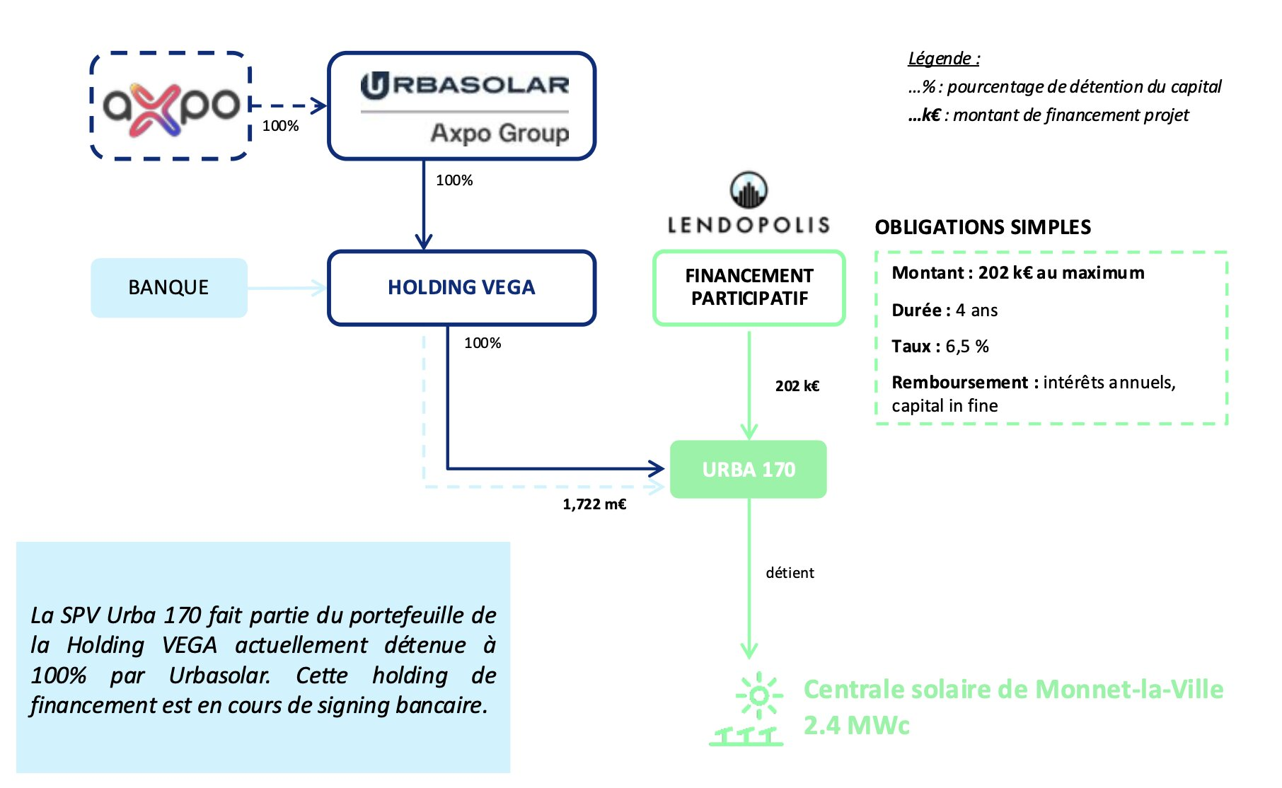Ainsi, la société Urba 235, propriétaire de la centrale et filiale à 100% du groupe Urbasolar, réalise une émission d’obligations simples d’un montant cible de 202 000 €, afin de financer en partie la construction et l’exploitation de cette centrale.