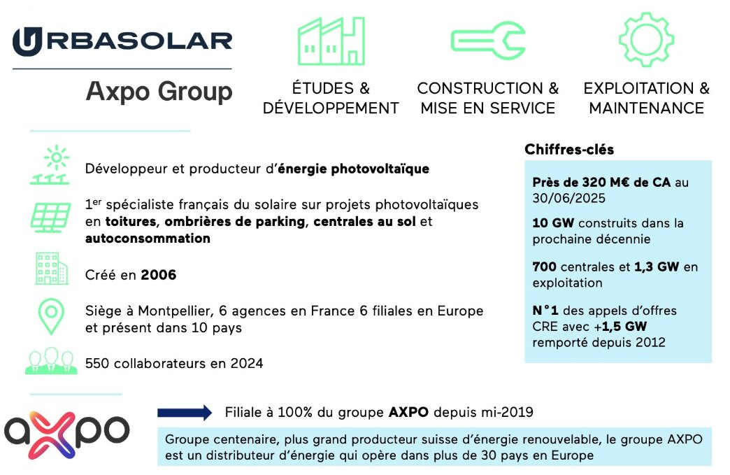 Division solaire du groupe suisse Axpo - distributeur et spécialiste des énergies renouvelables ; leader européen dans le domaine du négoce de l’énergie - Urbasolar agit pour un déploiement massif de l’énergie solaire, avec l’implantation d’actifs répondant aux plus hautes exigences de qualité, œuvrant pour une production d’énergie décarbonée à l’échelle européenne.