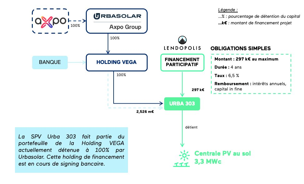 Ainsi, la société Urba 303, propriétaire de la centrale et filiale à 100% du groupe Urbasolar, réalise une émission d’obligations simples d’un montant cible de 297k€, afin de financer en partie la construction et l’exploitation de cette centrale.