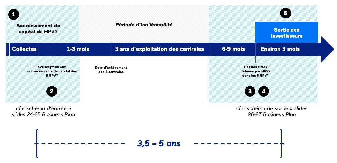 La participation des investisseurs à la présente opération de financement en actions de 5.809 K€ permettra à la société Horizon Photovoltaïque 27, dont ces derniers seront devenus ensemble les seuls actionnaires, de souscrire aux accroissements de capital des sociétés de projet :