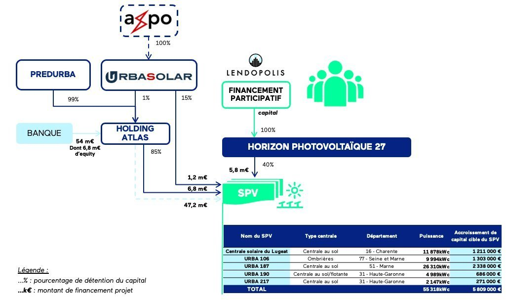 La société Horizon Photovoltaïque 27, créée avec pour unique objectif de permettre aux investisseurs Lendopolis de prendre part au financement de ces projets, souscrira ainsi aux accroissements de capital des sociétés de projets suivantes : Centrale solaire du Lugeat, Urba 106, Urba 187, Urba 190 et Urba 217.