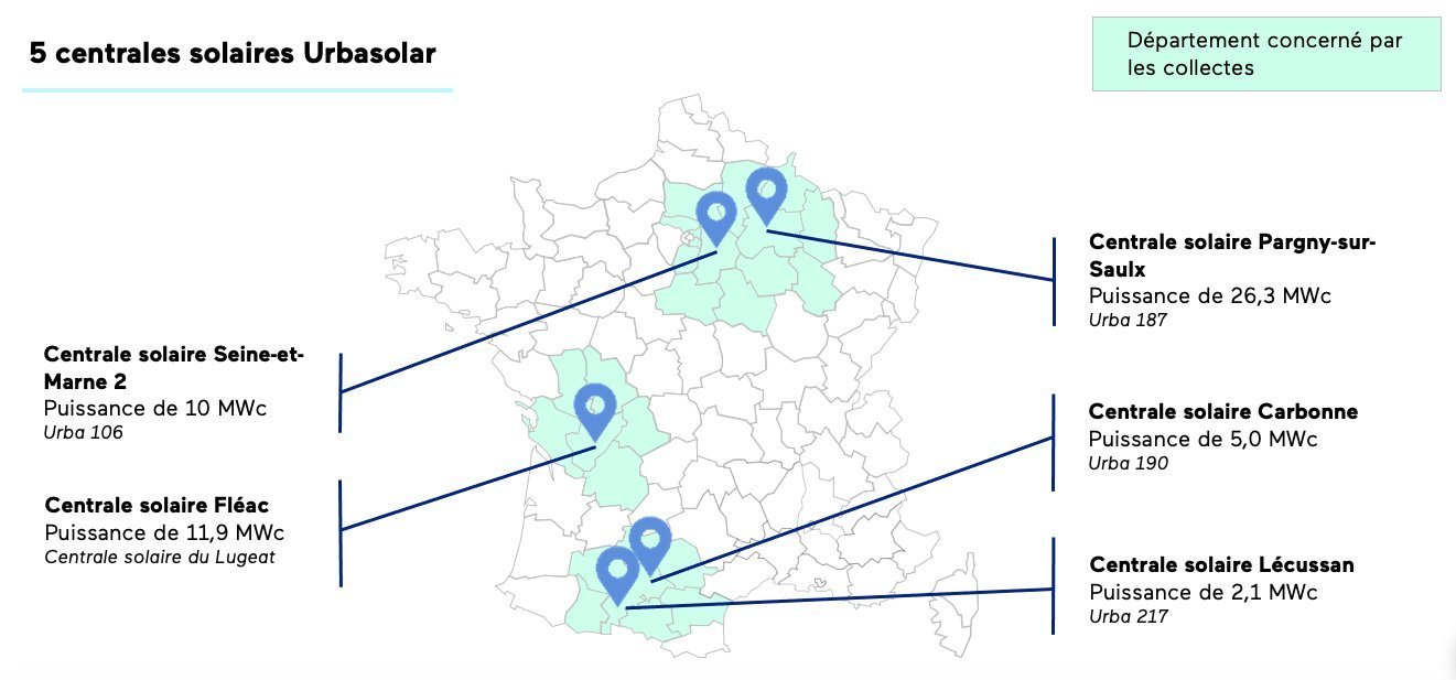 Le groupe Urbasolar a développé cinq centrales photovoltaïques, toutes lauréates de la sixième tranche des appels d'offres CRE 4 « centrales solaires au sol » d’une puissance totale cumulée de 55,3 MWc. Les centrales ont à ce titre obtenu un contrat de complément de rémunération de l’électricité produite, valable sur 20 ans. Dans le cadre de ces appels d'offres, Urbasolar s'est engagé, en échange d'une bonification de son tarif de rachat, à proposer aux habitants des départements d'implantation des projets et des départements limitrophes une partie de leur financement.