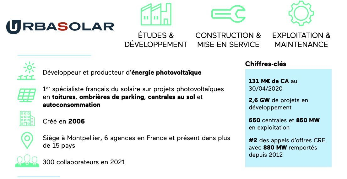 Acteur intégré, Urbasolar exploite à ce jour un parc de 850 MW constitué de 650 centrales photovoltaïques détenues majoritairement en propre et qui ont été développées et construites par ses équipes.