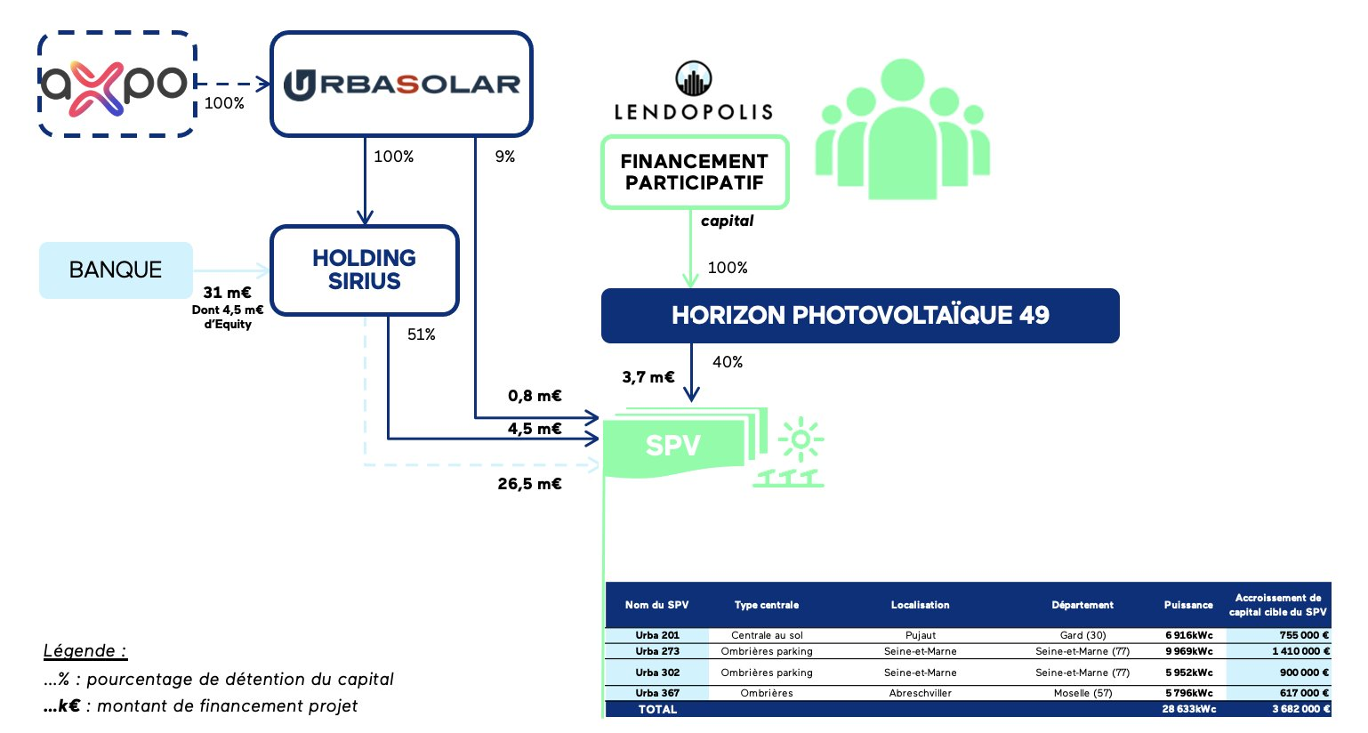 La société Horizon Photovoltaïque 49, créée avec pour unique objectif de permettre aux investisseurs Lendopolis de prendre part au financement de ces projets, souscrira ainsi aux accroissements de capital des sociétés de projets suivantes : Urba 201, Urba 273, Urba 302 et Urba 367.