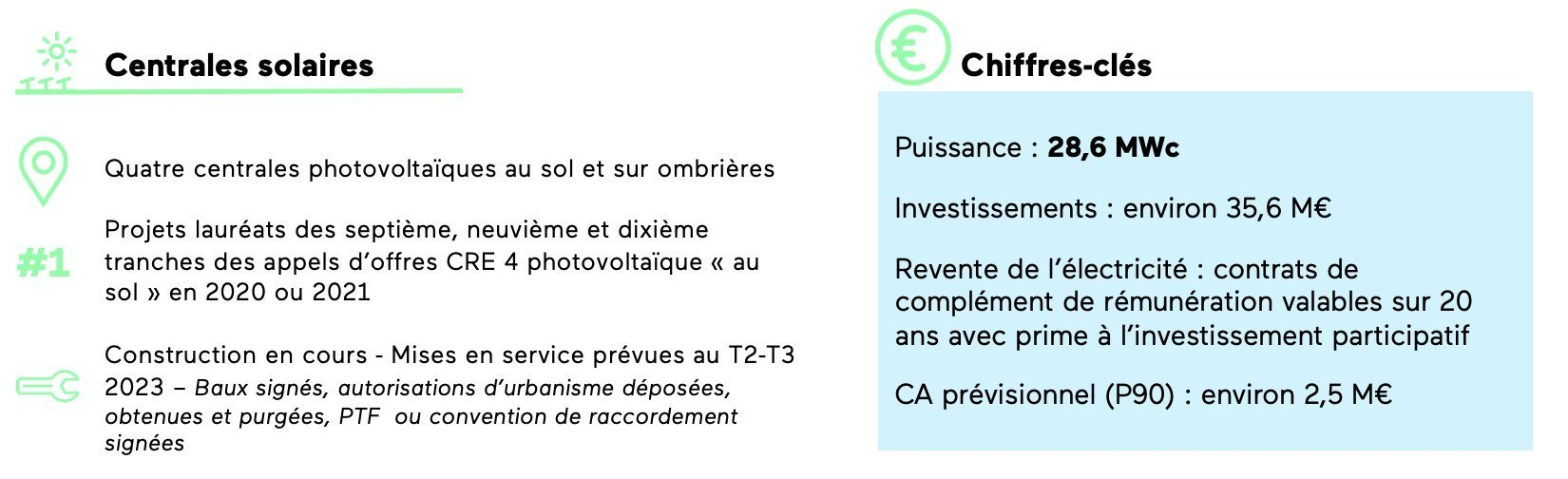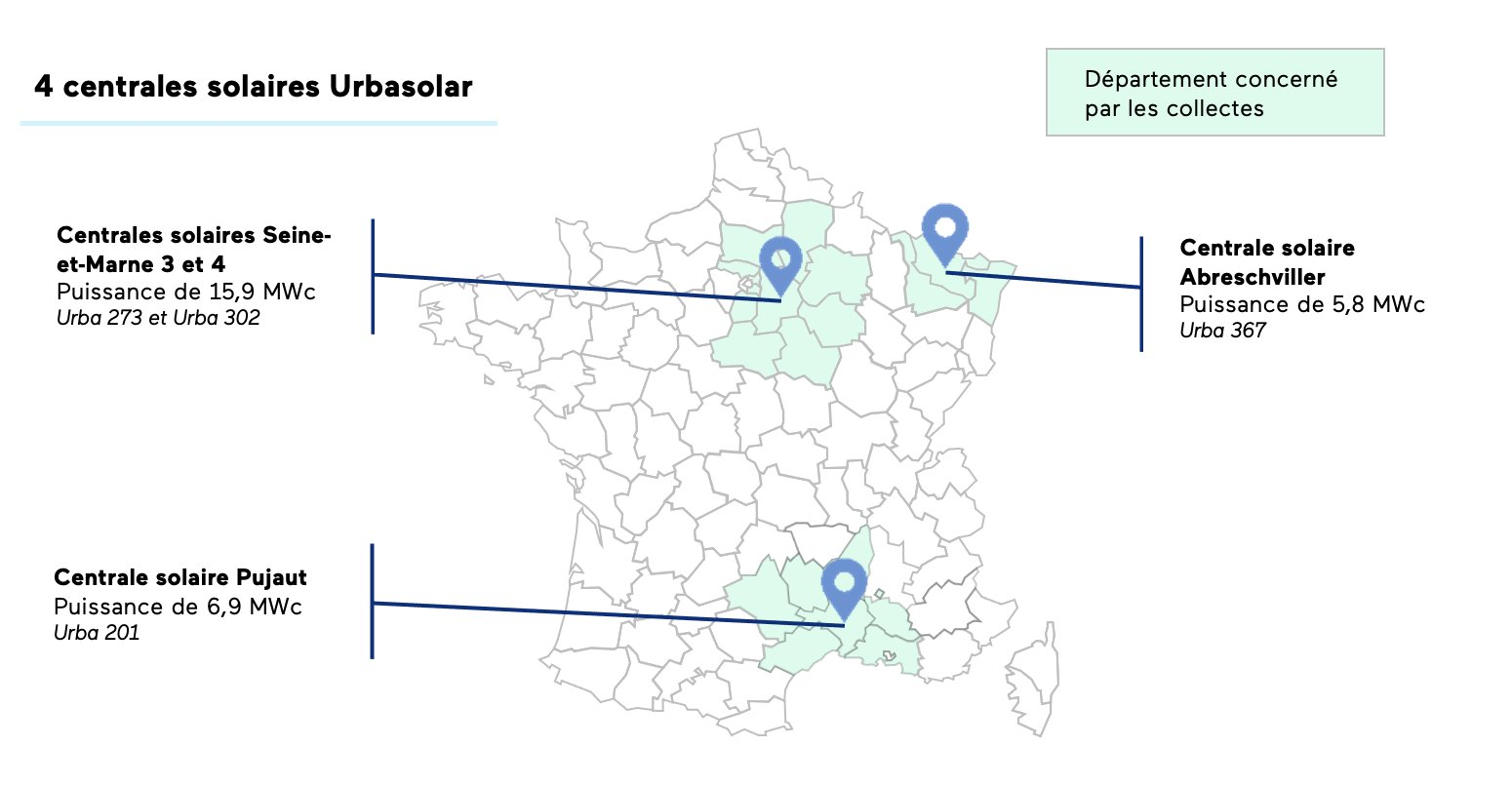 Le groupe Urbasolar a développé quatre centrales photovoltaïques, lauréates des septième, neuvième et dixième tranches des appels d'offres CRE 4 « centrales solaires au sol » d’une puissance totale de 28,6 MWc. Les centrales ont à ce titre obtenu un contrat de complément de rémunération de l’électricité produite, valable sur 20 ans. Dans le cadre de ces appels d'offres, Urbasolar s'est engagé, en échange d'une bonification de leur tarif de rachat, à proposer aux habitants des départements d'implantation des projet et des départements limitrophes une partie de leur financement.