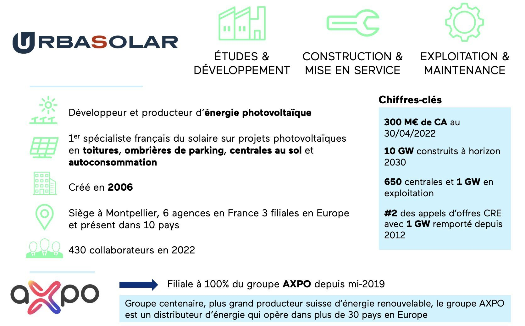 Filiale du groupe Axpo - distributeur et spécialiste des énergies renouvelables ; leader européen dans le domaine du négoce de l’énergie - Urbasolar agit pour un déploiement massif de l’énergie solaire, avec l’implantation d’actifs répondant aux plus hautes exigences de qualité, œuvrant pour une production d’énergie décarbonée à l’échelle européenne.