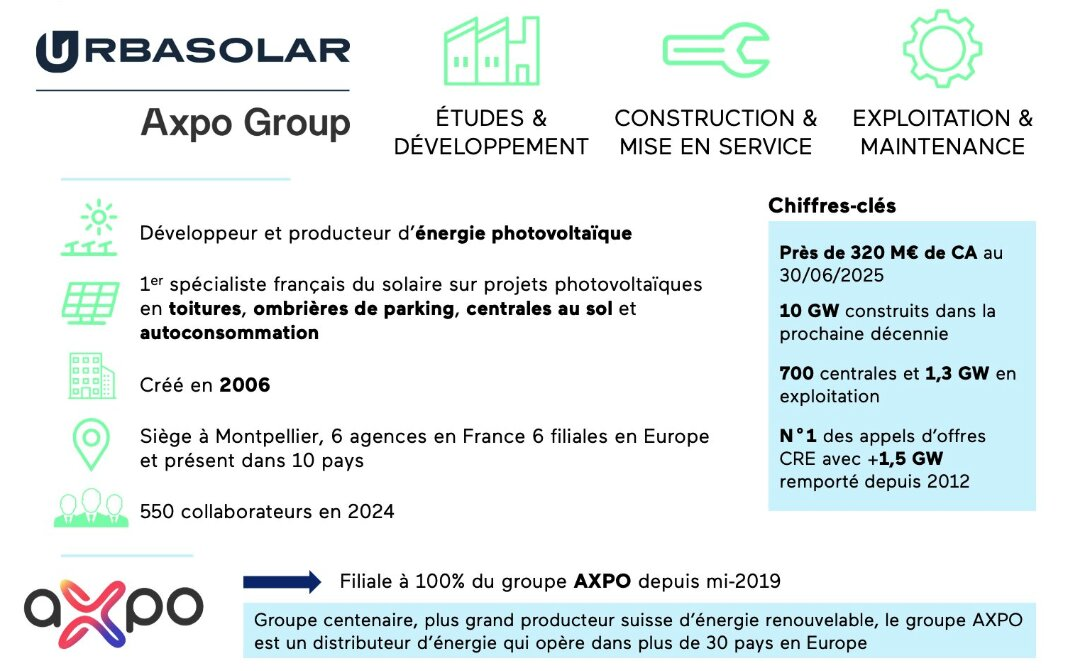 Division solaire du groupe suisse Axpo - distributeur et spécialiste des énergies renouvelables ; leader européen dans le domaine du négoce de l’énergie - Urbasolar agit pour un déploiement massif de l’énergie solaire, avec l’implantation d’actifs répondant aux plus hautes exigences de qualité, œuvrant pour une production d’énergie décarbonée à l’échelle européenne.