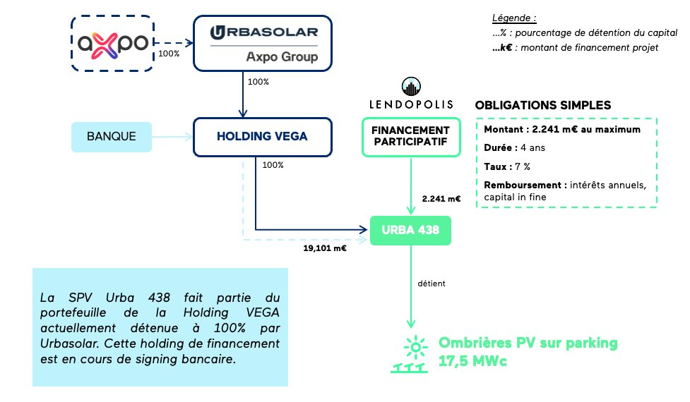 Ainsi, la société Urba 438, propriétaire de la centrale et filiale à 100% du groupe Urbasolar, réalise une émission d’obligations simples d’un montant cible de 2.241 M€, afin de financer en partie la construction et l’exploitation de cette centrale.